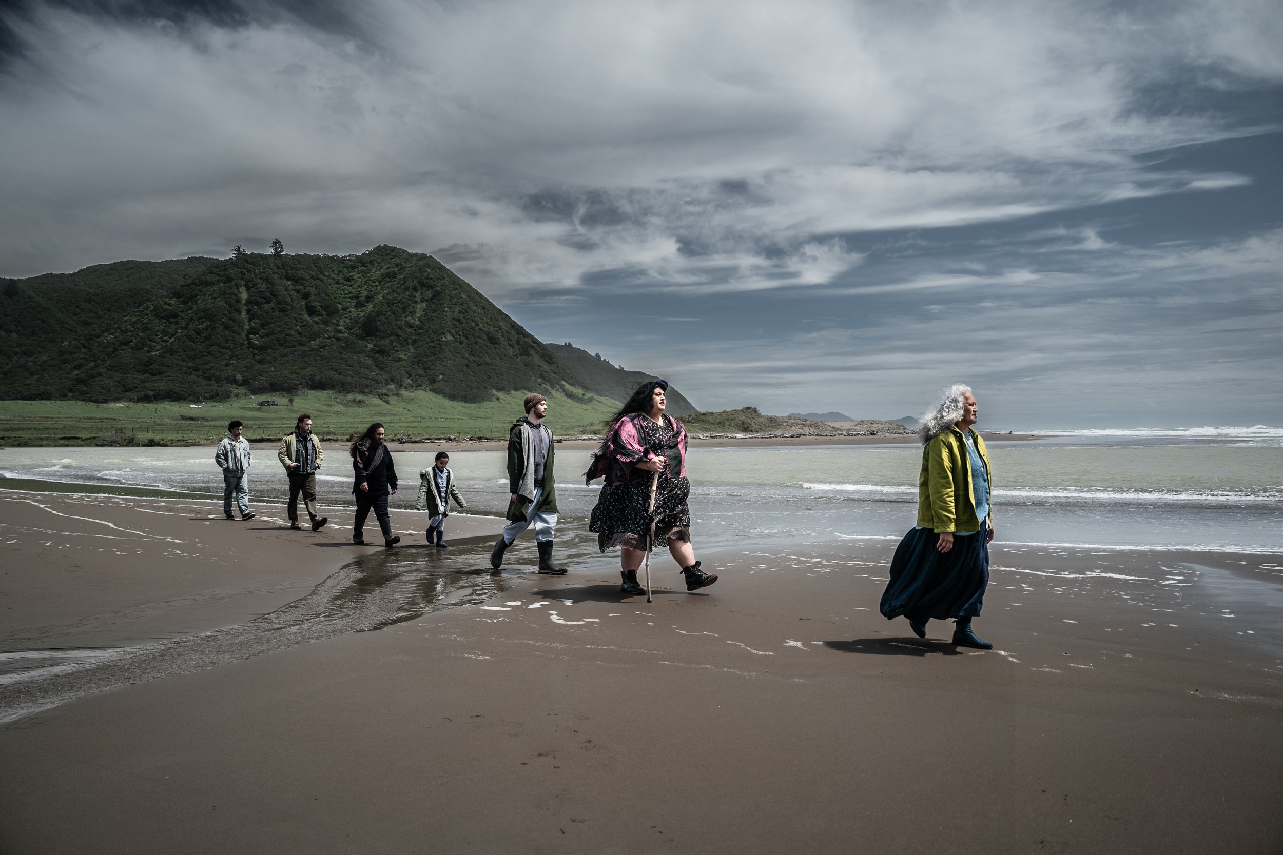 The grey waters of the ocean foam over black sand. On the East coast of Aotearoa’s North Island stands Māori kuia elder, Hamo (Hinetu Dell). The sky above her is night, but it is not dark. Stars rise over the horizon, significant in their light and knowing of Hamo’s return to her whenua (land).